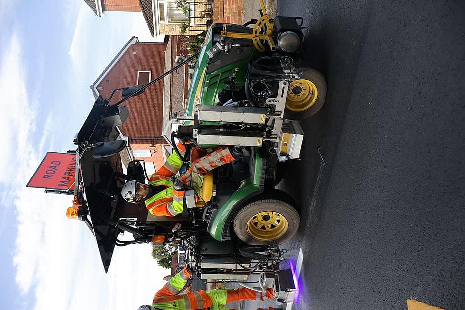 RapidLine is a 100% solids UV-cure material, meaning there is no volatile organic compounds (VOCs) used in the curing process. Developed for efficiency, safety, and visibility, RapidLine sets a new standard in performance for road markings. It is applied using advanced spray and drop on bead systems and then cured instantly using world-leading LED UV technology. This means RapidLine is trafficable immediately, a game-changer for road marking operations.