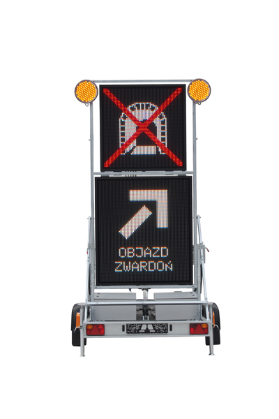 UOPG3 B1 is a mobile version of a variable message sign. It consists of a single-axle trailer, a VMS set and an independent power battery supply system and is designed to support road works away from the power grid. The graphic matrix with LED full RGB colour technology enables you to display any signs (warning, prohibition, injunction, information), any alphanumeric characters, graphics and symbols. Content can be presented as a static image, sequential images or a short animation.