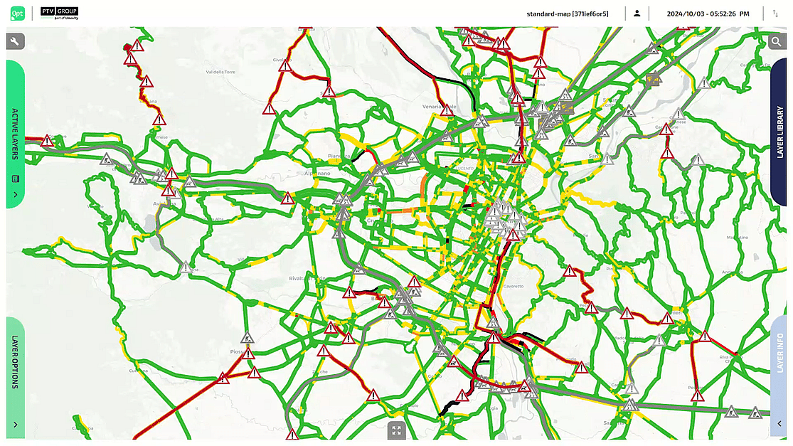 The traffic management software PTV Optima connects to all your sensor data, including from public transport. It helps operators identify the best scenarios to manage congestion, road closures and construction sites, and to accurately simulate the resulting network performances. PTV Optima continuously reacts to changing conditions. It provides live information, enabling you to optimize network efficiency and increase user satisfaction - without adding new roads or services.