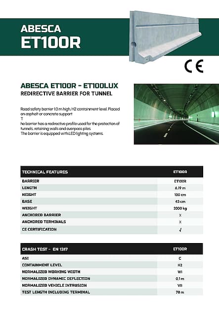Road safety barrier 1.0 m high, H2 containment level. Placed on asphalt or concrete support. The barrier has a redirective profile which is used for the protection of tunnels, retaining walls and overpass piles. The barrier is equipped with lighting systems