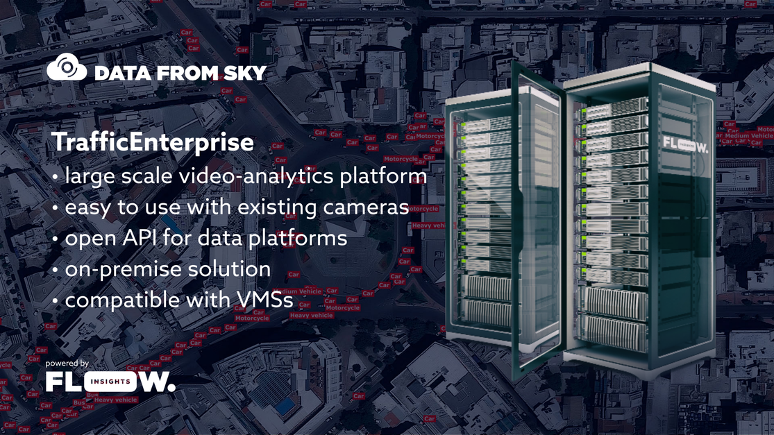 DataFromSky is delivering cutting-edge traffic video analytics solutions since 2013. Our FLOW, next-gen traffic AI system, allows you to gather almost any type of traffic data from basic counts to various traffic events and violations. FLOW runs directly in smart cameras, standalone edge devices, or different types of servers. With it, you can create an unlimited number of traffic sensors in a single camera view and utilize the data to improve traffic flow and road safety.