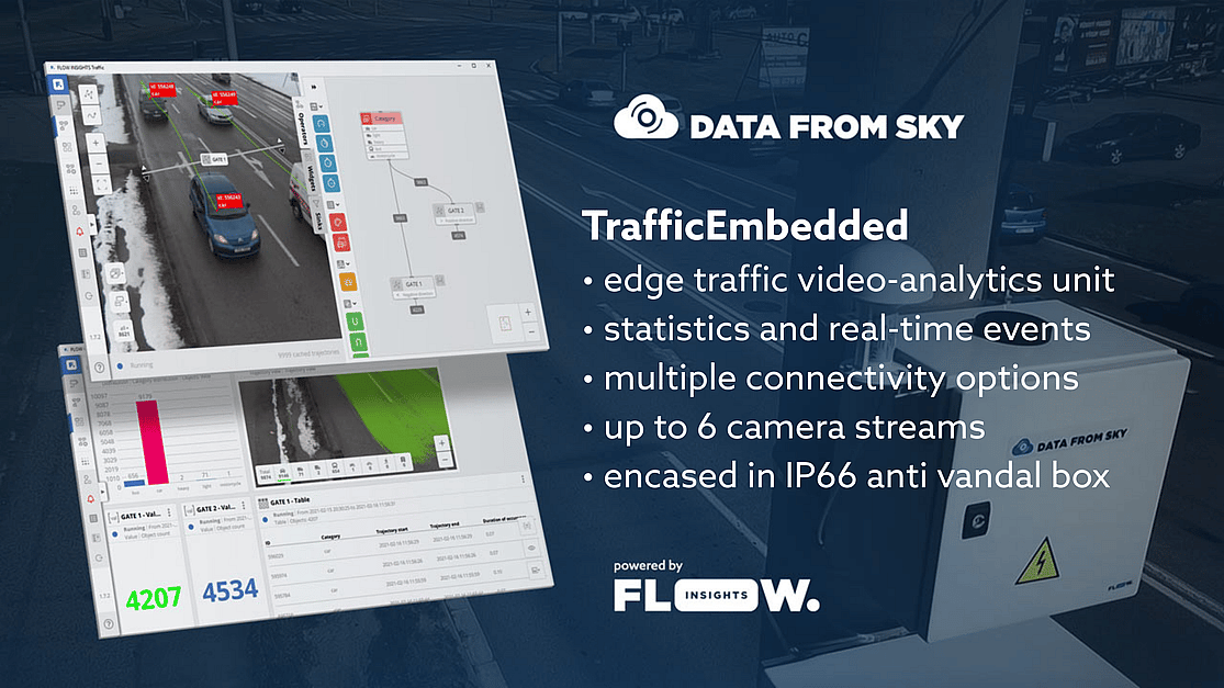TrafficEmbbeded is a real-time video analysis unit that turns up to 6 IP camera streams into smart multipurpose traffic sensors. Based on deep neural networks, Embedded represents a new generation of edge solutions enabling all the features of a distributed video analytics environment. It is powered by the most advanced traffic analytic framework FLOW which makes it an ideal choice for traffic monitoring, traffic control, or traffic violation detection.