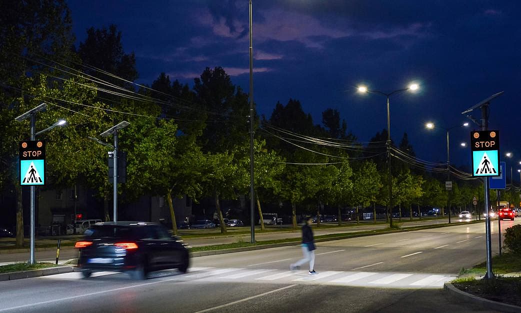 Safety systems for pedestrian crossing consist of at least two variable message signs which are activated when pedestrians or vehicles approach. They are equipped with a pedestrian movement sensor or Doppler radar. This safety system warns drivers that the pedestrian is going to cross the street. Drivers are warned to adjust speed and stop safely in front of the pedestrian crossing.