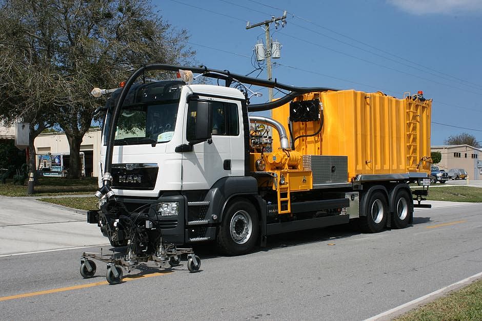 The Stripe Hog SH8000 is a water blasting and recovery system designed for either asphalt or concrete airfields and roadways for paint and thermoplastic removal, surface preparation, road retexturing, hydraulic spill cleanup.