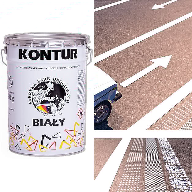 The paint is made on the basis of acrylic resins. The composition of the paint guarantees its long life, quick drying as well as bright and steady whiteness. KONTUR paint is a well-adhering product that has a high color strength and abrasion resistance. Paint is available also in yellow, red, blue and black color. KONTUR paint is intended to perform all types of thin-film horizontal road markings, squares, parking lots and other road and communication services with asphalt or concrete surfaces.