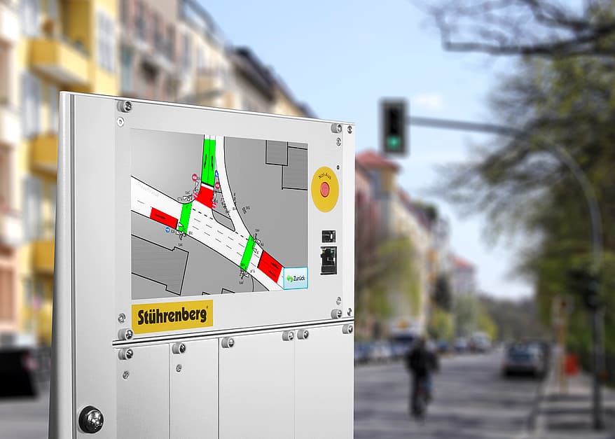 The new 7-inch touch control panel for STm.5 and STm.6 controllers is characterised by intuitive operation and a high range of functions. The animated site plan provides an overview of signal groups, detectors and AP values. User interfaces can be set up for individual user groups as required, e.g. to avoid operating errors. The control panel is also available as a retrofit kit for STm.5 controllers already in the market.