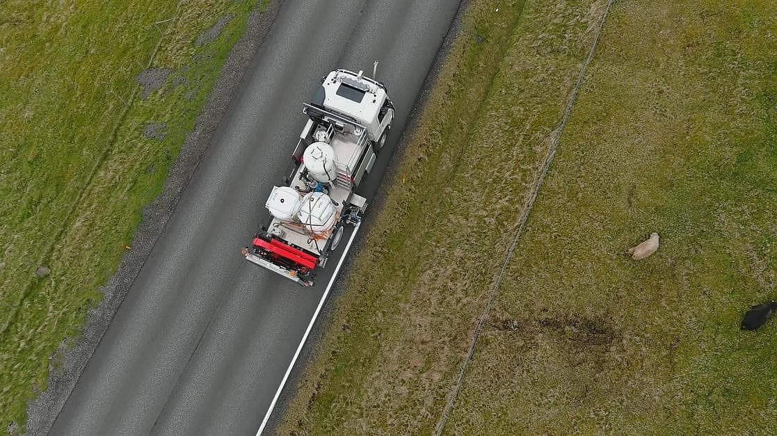 The cold paint trucks are operated by one or two persons working in the truck-cabin’s safe and comfortable environment, from where all line marking is controlled by the LineController with remote controls. The road marking material is applied by paint guns mounted on hydraulically operated gun wagons, just in front of the rear wheels. Line marking is monitored from inside cabin by mirror and a monitor, while the driver keeps a straight line by means of an aiming bar in front of the truck.