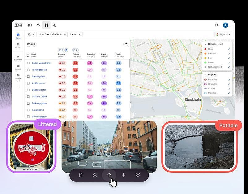 3DAI™ converts imagery from everyday vehicles into structured data on road condition and roadside assets. It detects and maps road defects such as potholes, cracks and surface wear, alongside assets like signs and streetlights, helping teams compare conditions across the network over time. This supports consistent reporting, better-informed maintenance follow-up and safer roads.